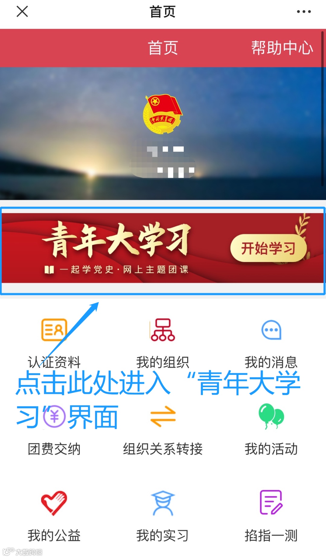 微信公众号“12355青年之声”主页在菜单栏处点击“智慧团建”菜单”点击任意处进入