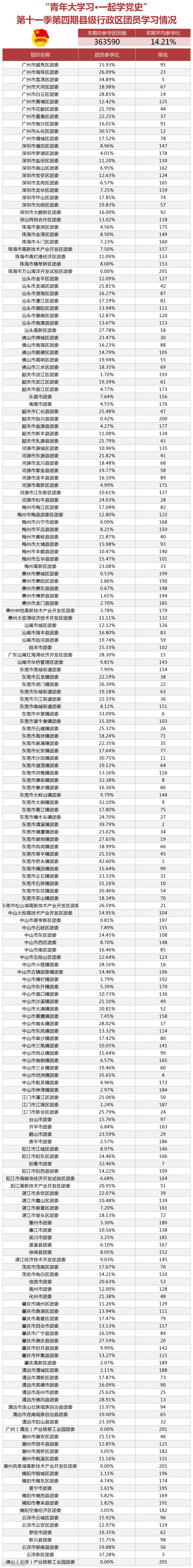 在各地市参学比上,东莞、广州、江门参学率最高。参学比低于25%的地市,在接下来的学习中需进一步努力,采取有力措施,加强组织建设,有效提升引领力。