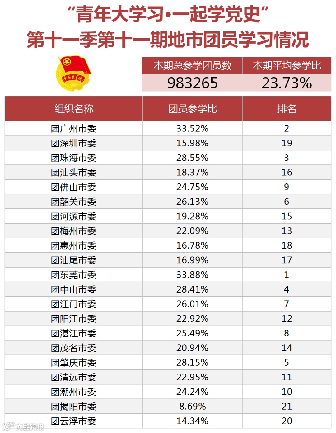 在各地市参学比上,东莞、广州、珠海参学率最高。参学比低于25%的地市,在接下来的学习中需进一步努力,采取有力措施,加强组织建设,有效提升引领力。