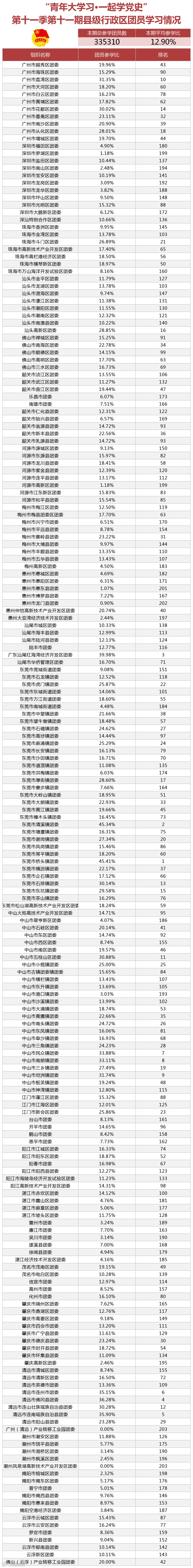 在各区县参学比上,东莞市桥头镇、东莞市清溪镇、汕尾市红海湾经济开发区参学率最高。参学比低于15%的区县,在接下来的学习中需进一步努力,采取有力措施,加强组织建设,有效提升引领力。