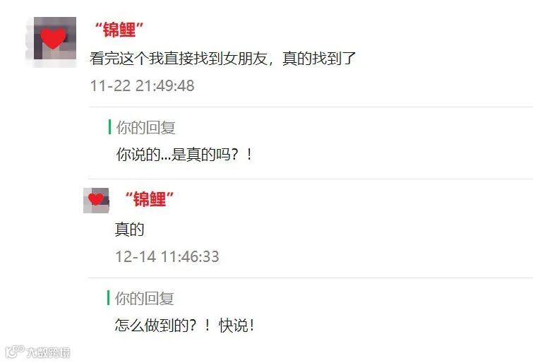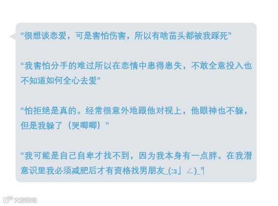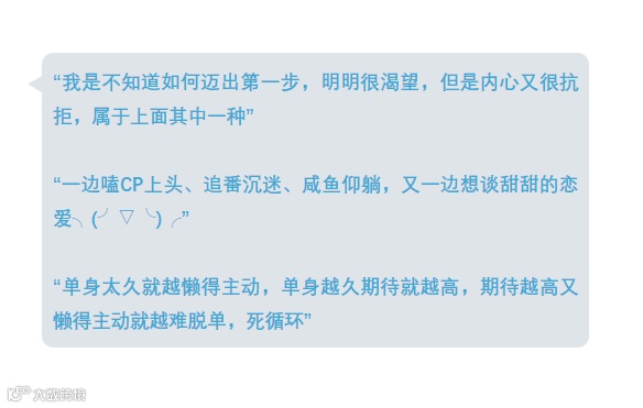 文章发出后,各种各样的“恋爱宣言”从四面八方涌进后台,有赤果果问我们要对象的(对,别看别人,就是你),有让人吃柠檬的恩爱片段,有享受当下认为一个人也很好的,也有对爱情和恋爱中的自我认识和剖析,还有“锦鲤本鲤”:看完文章就脱了单