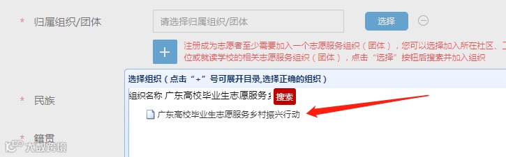 “归属组织”搜索选择“广东高校毕业生志愿服务乡村振兴行动”