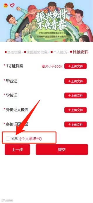 2.根据要求填写基础信息、志愿服务信息、个人信息,填写完毕后点击“下一步”,系统将自动保存填写信息;上传相关资料图片(图片格式仅限jpg、png,1寸证件照大小需小于300k)。