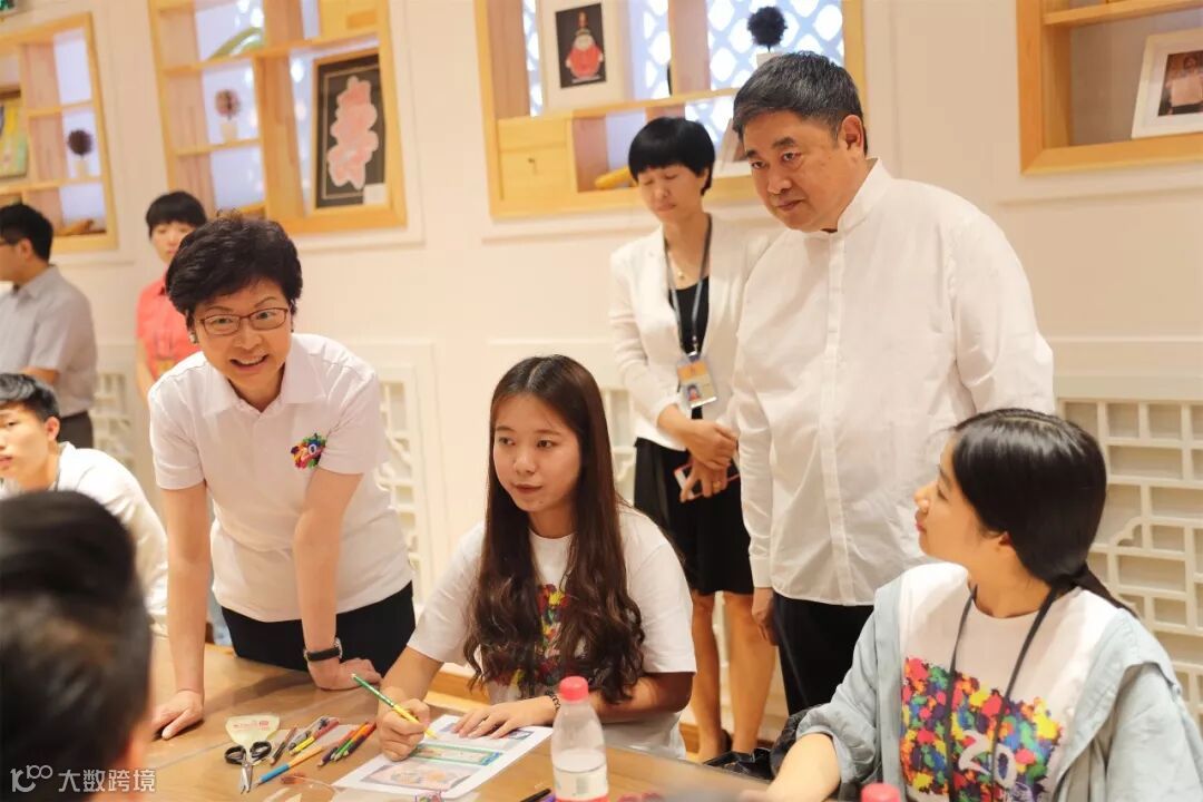 ▲“故宫博物院青年实习计划”的30名港、粤学生,与香港特区政府行政长官林郑月娥、故宫博物院院长单霁翔共一起参与故宫的青少年教育体验活动,参观“紫禁城与‘海上丝绸之路’”展