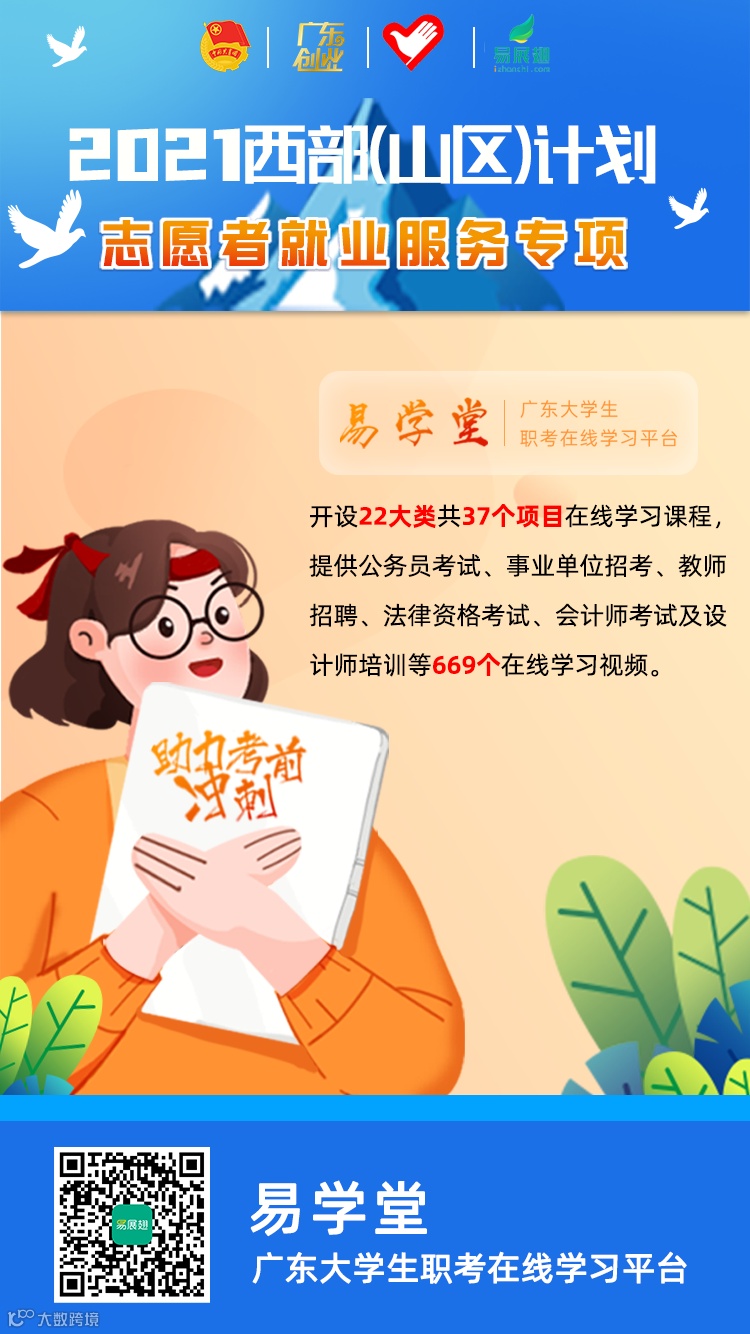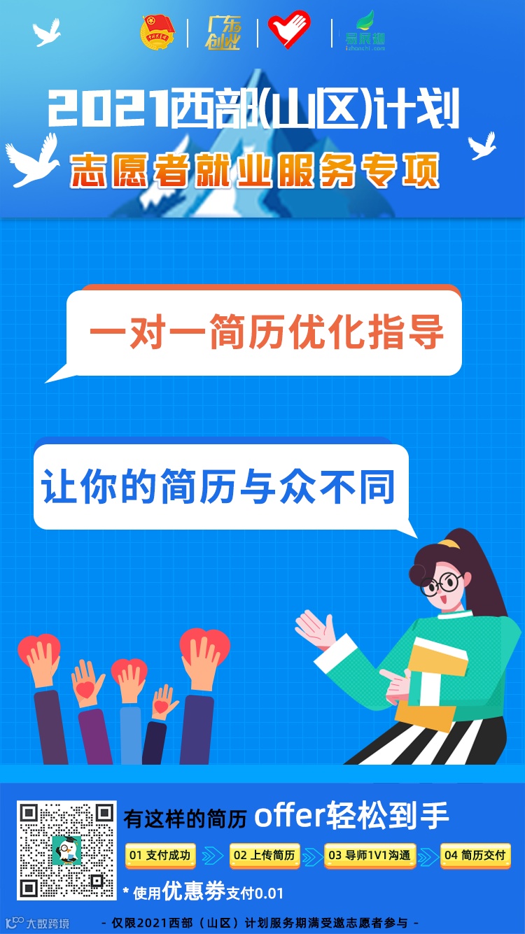 为落实团中央关于做好疫情冲击下青年就业工作的有关要求,积极帮助西部(山区)计划服务期满志愿者及希望乡村教师计划服务期满志愿者提高就业技能和就业水平。结合需求调研实际情况,广东省青年创业就业促进中心联合广东省志愿者行动指导中心、广东省青少年发展基金会及易展翅面向西部(山区)计划服务期满志愿者,开展西部(山区)计划志愿者就业专项行动,通过开展就业指导、一对一就业推荐及定制化助考课程培训等服务举措,多渠道多形式帮助服务期满志愿者提升职业技能,拓宽就业渠道,实现高质量就业。