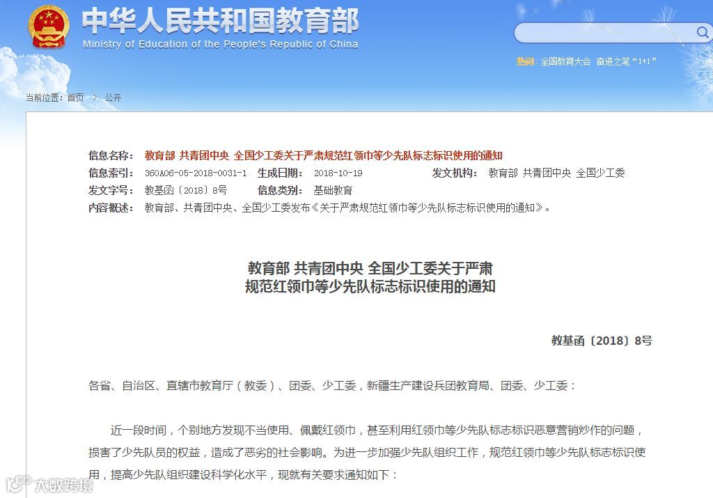 近一段时间,个别地方发现不当使用、佩戴红领巾,甚至利用红领巾等少先队标志标识恶意营销炒作的问题,损害了少先队员的权益,造成了恶劣的社会影响。为进一步加强少先队组织工作,规范红领巾等少先队标志标识使用,提高少先队组织建设科学化水平,现就有关要求通知如下: