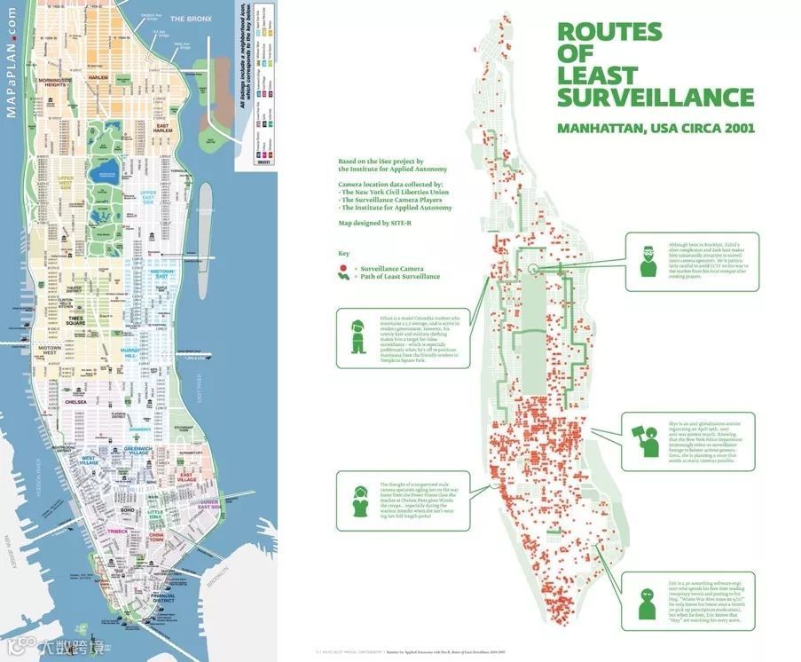 右边这个地图,是一个穆斯林在曼哈顿生活了20年之后,把曼哈顿每一个摄像头都标出来了,最后发现三条没有摄像头的路。