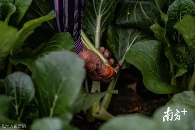 阿牛阿加奶奶正在蔬菜基地采摘甜菜心。她的双手,满是岁月留下的痕迹。