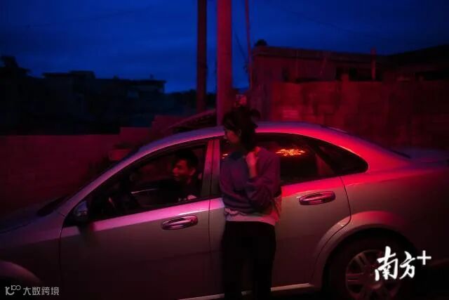 9月10日傍晚,大塘镇上,黄思铭靠在车旁与同一批到大塘镇进行帮扶的曾祥佳医生聊天,这台车是他们在镇上唯一的出行工具。
