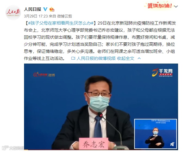3月29日在北京新冠肺炎疫情防控工作新闻发布会上,专家提到了孩子父母在家相看两生厌怎么办的问题。