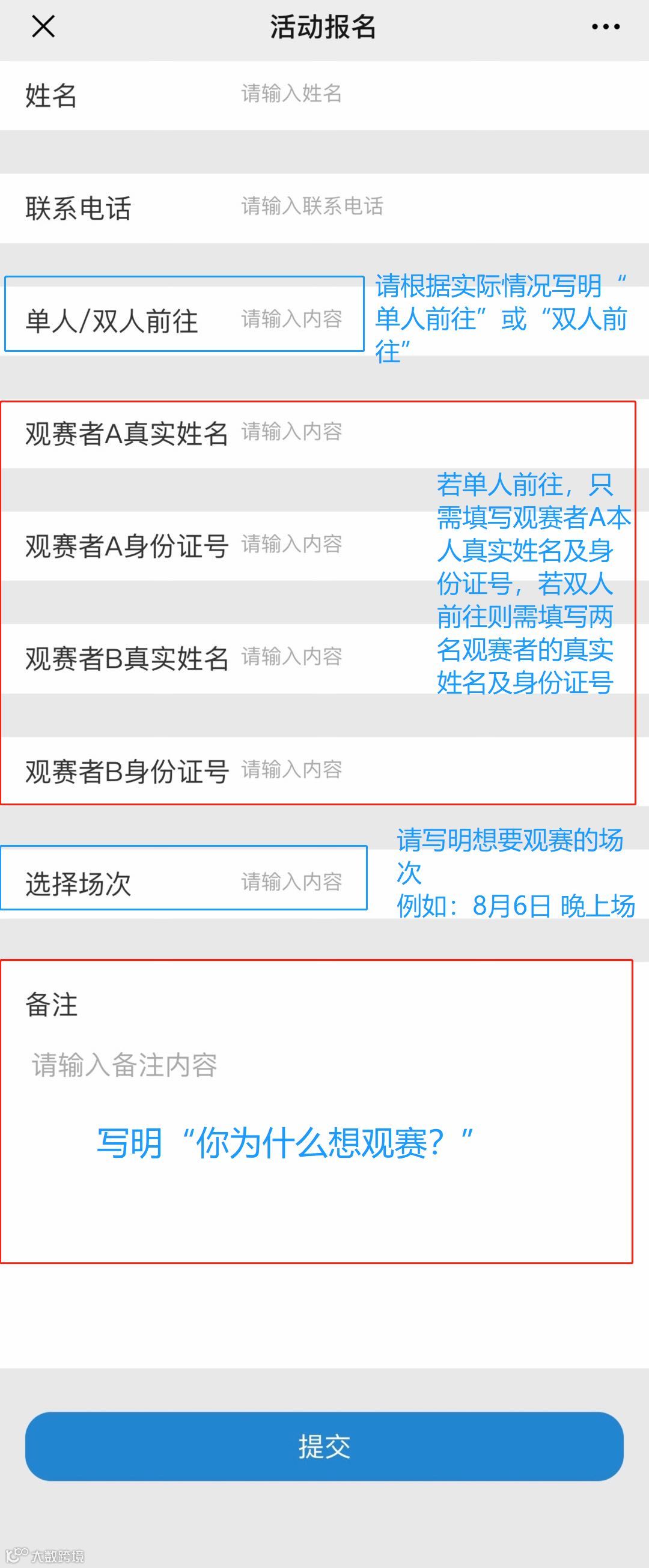 包括姓名、联系方式、全部观赛者的真实姓名和身份证号、选择场次
