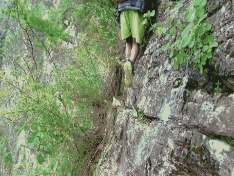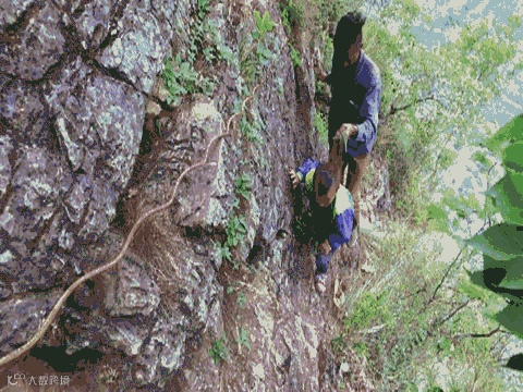 ▲在爬垂直藤梯的时候,陈古吉会从后面微微提绳,让儿子能够省点力气,跟上前面的哥哥姐姐。在通过没有任何附着物的崖壁上的道路时,陈古吉就格外小心,紧抓绳子的手有时青筋暴起。