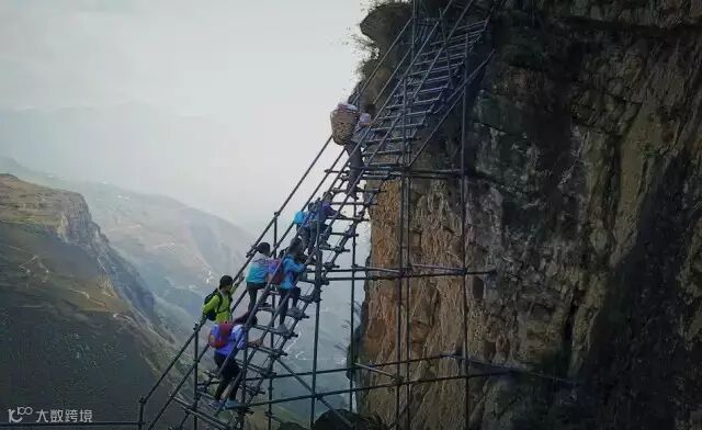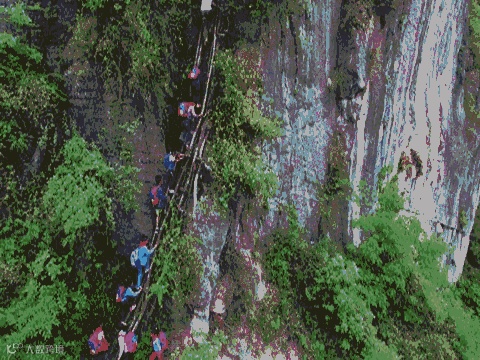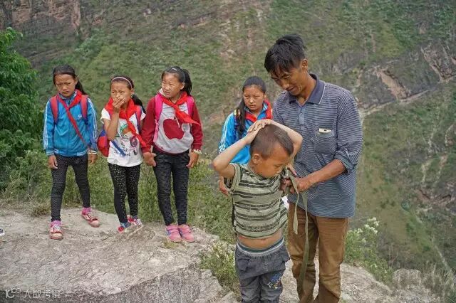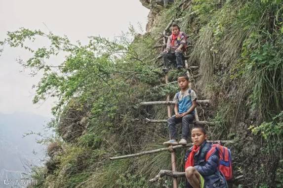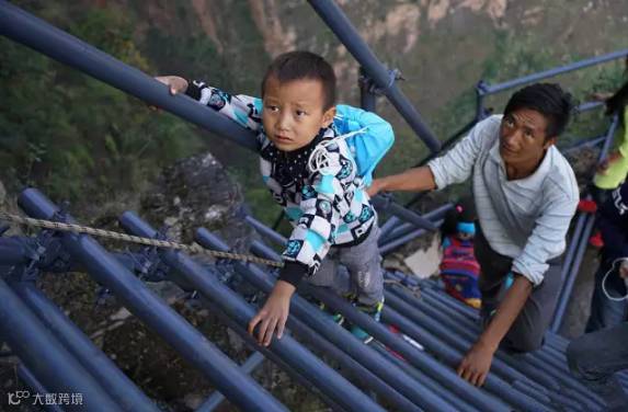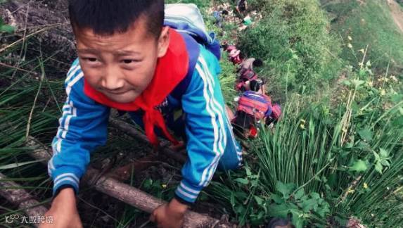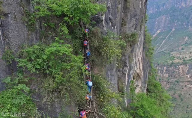▲上学的孩子都背着沉沉的书包,一步一步攀爬在悬崖峭壁上。