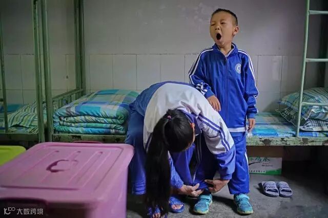 ▲早上起床,陈心明帮陈木黑穿衣服。学校安排陈心明和弟弟陈木黑睡一张床,主要是为了方便姐姐照顾弟弟。