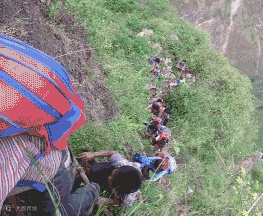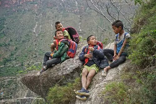 路上,孩子们累了,就坐靠在崖壁或藤梯上休息,他们的脚下,就是“万丈深渊”。