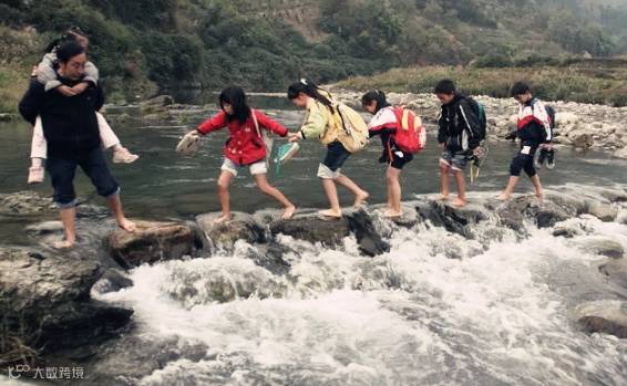 ▲2009年,湖北麂子渡村,上学路上,一位小学教师背着年幼点的学生,年龄大点的则手牵着手、光着脚踏着冰冷的河水一起渡河。