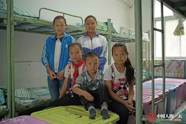 ▲大姐陈心明(后右)带着妹妹陈日只、陈惹作、陈日莫,还有不到6岁的弟弟陈木黑住在同一个女生宿舍。同住的还有其他各年级同学,宿舍12张床,24名学生。目前,新教学楼在建,9月1日开学前,孩子们将搬进新宿舍楼,一人一床。