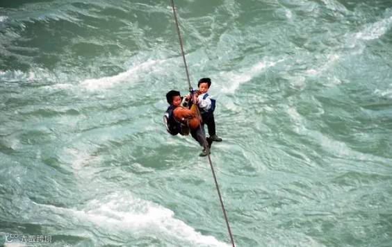 ▲2007年,为了上学,云南省怒江州福贡县马吉乡的孩子每天背着书包溜索往返怒江两岸。一根铁索、一个滑轮、一根布绳……马吉乡孩子每天上学、放学都要溜索飞过怒江。