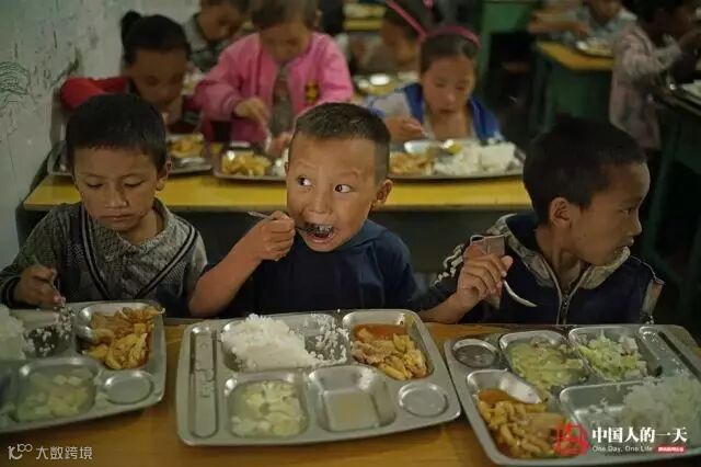 中饭时间,陈木黑和学前班的同学享用一荤两素的套餐。