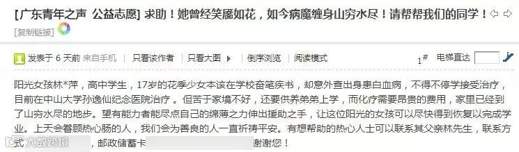 林峰萍,17岁,惠州市博罗县杨侨中学高二学生,于2016年1月22日查出急性B淋巴细胞白血病,目前已花光家庭所有积蓄,后续治疗费仍需数十万甚至百余万元。因其家境困难,无力承受高昂的医疗费用。2月17日,峰萍的同学们在广东“青年之声”平台发帖求助。随即,团省委、团惠州市委对此事进行了核实。