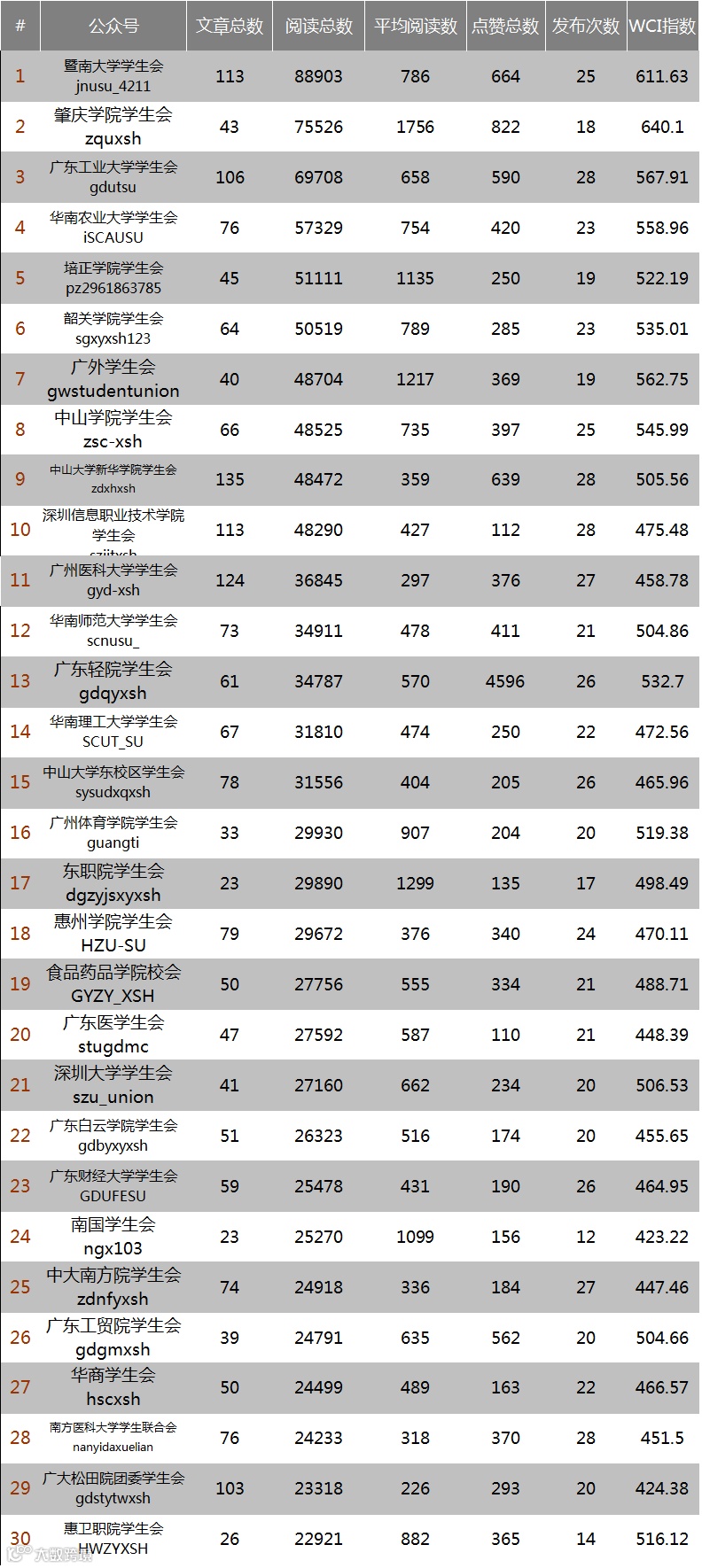 从总阅读量来看,几个排名靠前的学生会账号如肇庆学院学生会、暨南大学学生会、广东工业大学学生会、华南农业大学学生会,更多集中在广州的重点院校,有更大的学生用户基础。另外,仅从推送频度和文章总数来看,好的账号离不开用心、勤勉的运营。