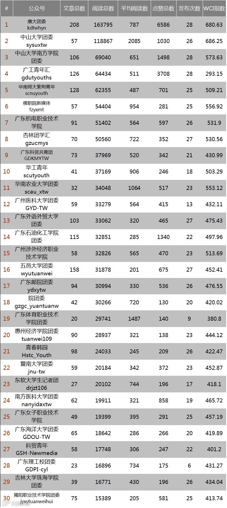 从综合指数(WCI)来看,前两位分别为中山大学团委和康大团委,分别代表了两个不同的运营方向。