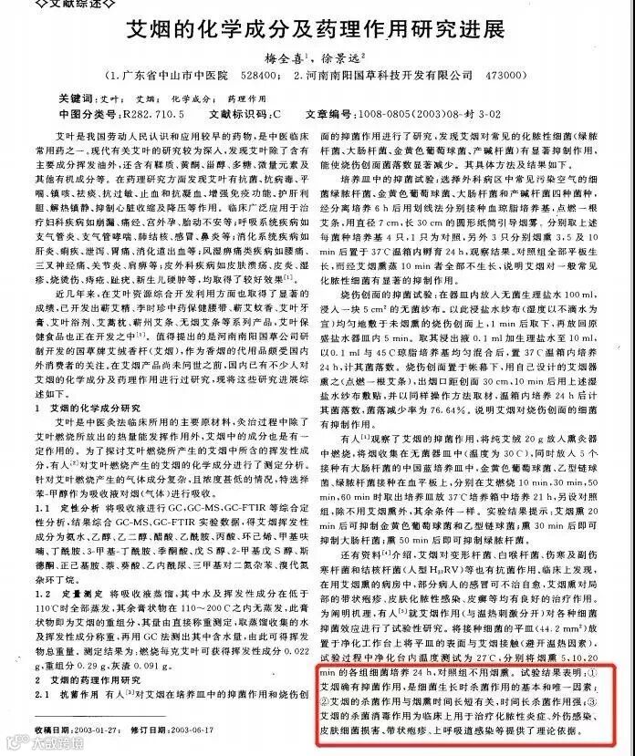 ③ 艾烟的杀菌消毒作用为临床上用于治疗化脓性炎症、外伤感染、皮肤细菌损害、带状疱疹、上呼吸道感染等提供了理论依据。