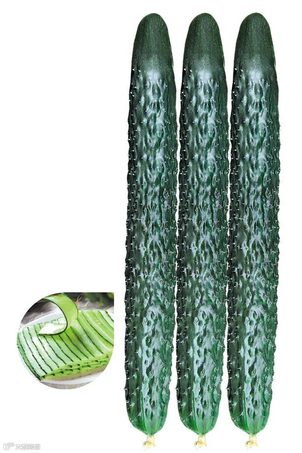 黑亮型高端品种,抗性及商品性俱佳 主要性状及适应性:新育成黑亮抗病黄瓜品种。早熟,植株综合抗性强,主蔓结瓜为主,连续结瓜力强,丰产潜力大。商品瓜一般平均长32-35cm左右,顺直,把短,皮色黑绿,油亮,刺瘤适中,果肉浅绿,肉质脆,风味浓,商品性特佳。适宜试种成功地区春秋栽培。