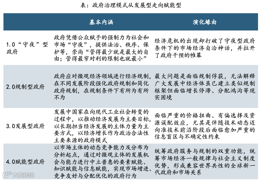 二是以数字治理发展顺应和推动政府治理形态之变。伴随政府公共行政走向公共治理,政府治理形态从1.0版的 “守夜”型政府、2.0版的规制型政府、3.0版的发展型政府向4.0版的创新赋能型政府方向转变,也使得“人治”、“德治”、“法治”走向“数治”。赋能型政府不仅能够统筹政府“服务”与“规制”的双重功能,还能统筹市场经济一般规律与社会主义制度优势,亦能顺应创新生态建设与数字治理的新趋势,形成新一代政府和市场关系。