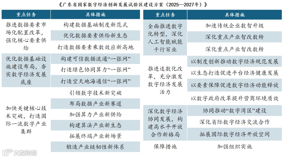 近日,广东省人民政府正式印发《广东省国家数字经济创新发展试验区建设方案(2025—2027年)》,目标到2027年,全省数字经济发展水平稳居全国首位,数字经济核心产业增加值占GDP比重超过16%,打造3个具有国际竞争力的万亿级数字产业集群,培育若干高价值数字产业新赛道。《方案》围绕推进数据要素市场化配置、数据基础设施建设、加快关键核心技术突破、推进数字化转型、推进适数化改革、深化数字经济协同发展等六方面,提出22条具体举措。其中,聚焦释放数据要素价值,明确将加快出台《广东省数据条例》,健全数据产权制度,并建立公共数据、企业数据、个人数据的分类分级确权授权机制;聚焦突破关键核心技术,将持续实施“广东强芯”工程、核心软件攻关工程,加强鹏城实验室等重大创新平台建设。