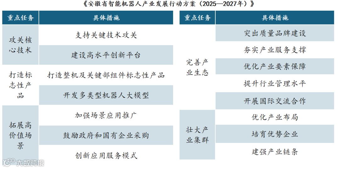11月20日,安徽省正式出台《安徽省智能机器人产业发展行动方案(2025—2027年)》,提出构建“十百千”发展格局,到2027年培育10家以上细分领域龙头企业、突破100项关键技术和标志性产品、全产业链营收达1000亿元。《行动方案》聚焦核心技术攻关、标志性产品打造、高价值场景拓展、产业集群壮大、产业生态完善五大重点任务系统布局,提出要围绕智能机器人本体设计、环境感知、运动控制、动态执行和人机交互等环节,突破一批关键共性技术;聚焦智慧“大脑”、敏捷“小脑”等智能决策与控制技术和强健“肢体”的高动态、高爆发、高精度运动结构,突破一批前沿引领技术;面向工业制造、民生服务、社会治理、安全应急、文化旅游等领域,打造一批智能机器人整机产品。此外,《行动方案》还提出争创智能机器人领域国家产业创新中心、国家技术创新中心、国家制造业创新中心等重大平台,支持建设智能机器人数据训练场等创新平台。