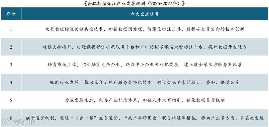 该规划立足合肥产业基础,以打造国际领先的数据标注创新基地为目标,为推进城市数字化转型提供核心支撑。《规划》明确了攻关数据标注关键共性技术、建设支撑项目、培育市场主体、赋能行业发展、营造发展生态、创新运营机制等六大重点任务。《规划》提出,力争到2027年底,合肥多语种标注和语音标注能力达到国际领先水平,围绕“人工智能+”和“数据要素×”重点行业,标注数据规模达3000TB,构建11个以上行业高质量数据集,拉动标注产业规模达30亿元,支撑相关产业规模超千亿,打造国际上有特色、有影响力的数据标注基地。