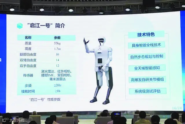 7月19日,安徽省人形机器人产业创新中心成立大会暨安徽省人形机器人重点实验室学术委员会第一次会议上,安徽省人形机器人产业创新中心、安徽省人形机器人重点实验室正式揭牌。现场安徽首款人形机器人整机产品“启江一号”重磅亮相,该机器人由江淮前沿技术协同创新中心自研,身高1.7米,体重55公斤,全身拥有36个自由度。搭载激光雷达、红外相机、毫米波雷达、腰部IMU、双目相机等传感器,续航时间超过1小时。