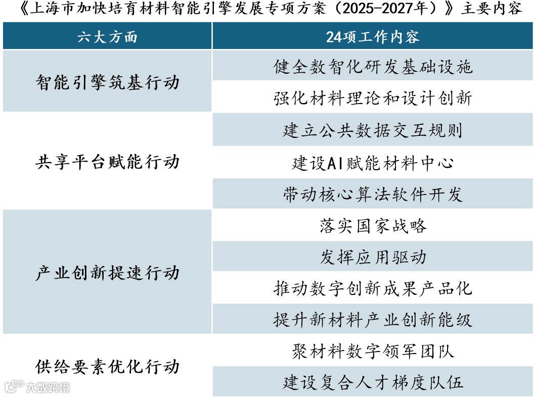 上海深入实施“人工智能+”行动。11月12日,多部门联合印发《上海市加快培育材料智能引擎发展专项方案(2025-2027年)》,抢抓新一代人工智能赋能材料发展的战略机遇,提出智能引擎筑基、共享平台赋能、产业创新提速、供给要素优化四方面行动;明确到2027年,建设1个AI赋能材料中心,加快大模型在新材料领域的垂类应用,建成一批高通量、智能化实验室,支撑细分领域垂类模型开发,培育20个应用人工智能设计材料的“进化中心”,开发10个左右通过人工智能设计的新材料产品。