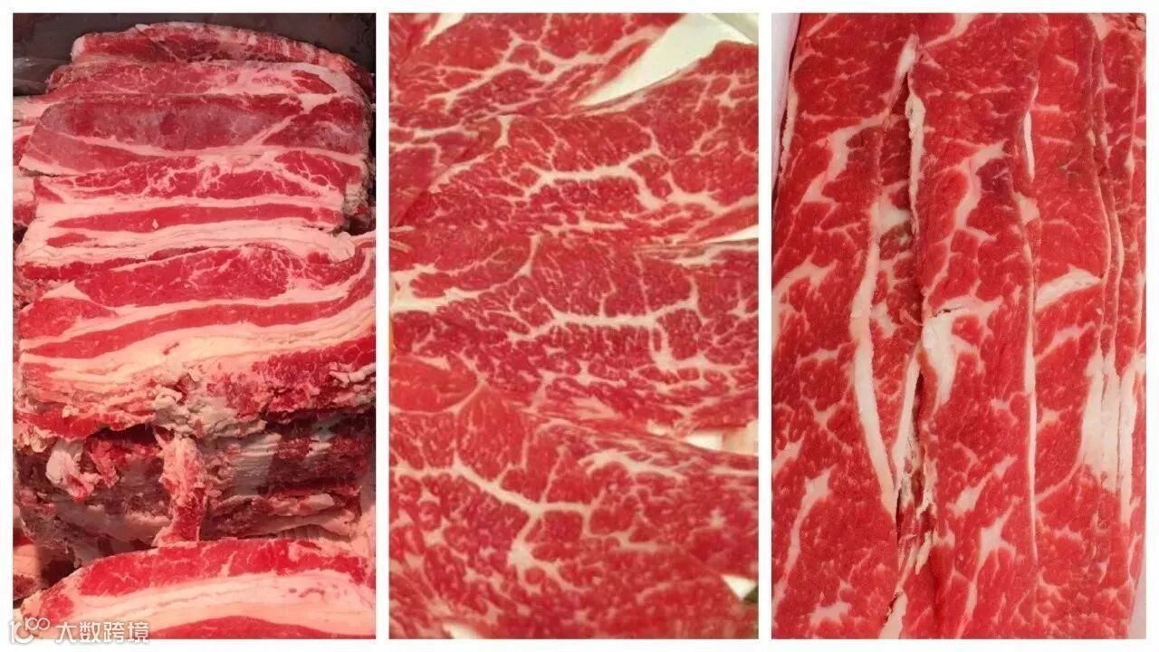从左到右依次为:美国肥牛、美国安格斯牛肉、中国肥牛