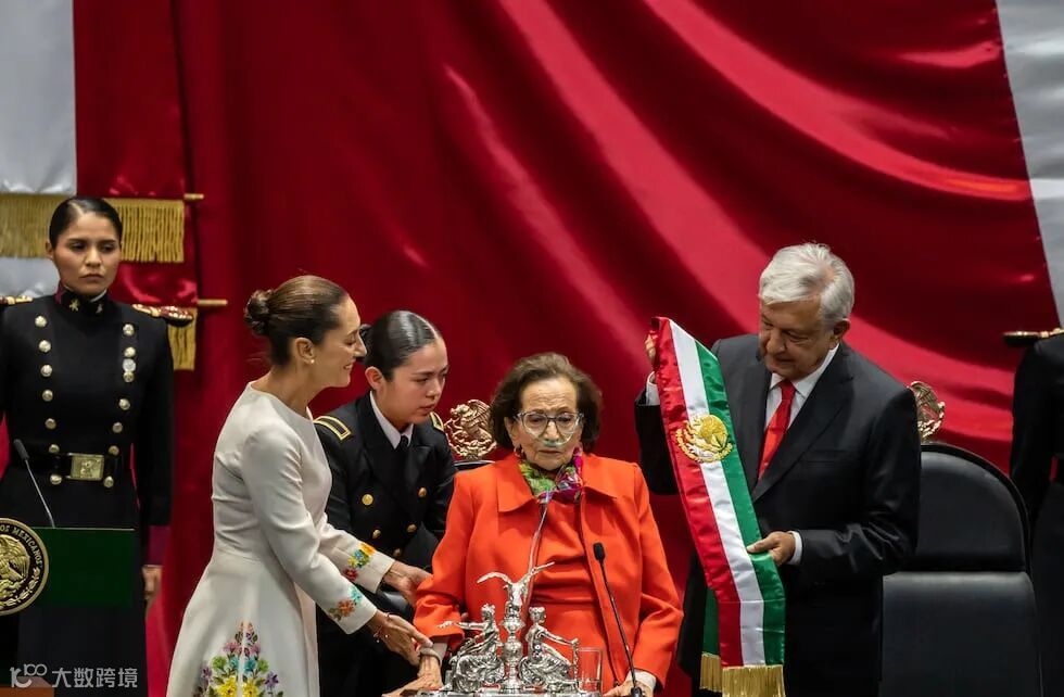 作为墨国的首位女总统,在佩戴总统标志彩带的环节,由现年94岁的议员,曾经担任墨西哥国立自治大学经济系的首位女主任,为辛鲍姆佩戴。