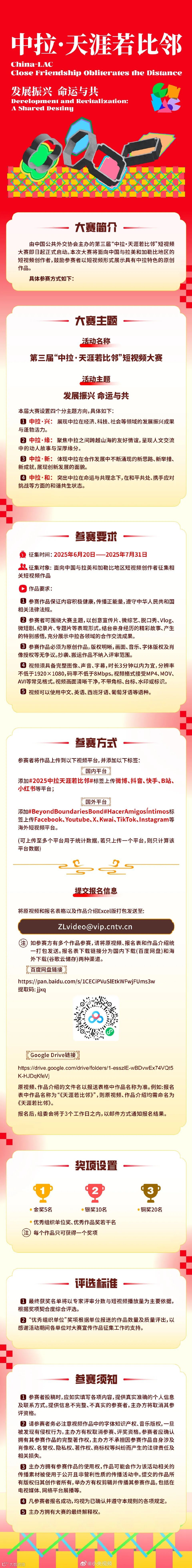2023年首届“中拉·天涯若比邻”短视频大赛成功举办,中拉广大网友共同参与创作,通过短视频搭建起展示多元文化、促进国际交流、增进人类友谊的桥梁。2024年第二届大赛以“山海同心 共赴新程”为主题,吸引了近600部作品参赛,拉方参赛者实现对所有拉美和加勒比国家全覆盖,促进了不同文化间的理解与欣赏。第三届“中拉·天涯若比邻”短视频大赛于2025年6月20日——7月31日展开,诚邀中国与拉美及加勒比地区的创作者共同参与,让世界看见中拉命运共同体的生动故事。
