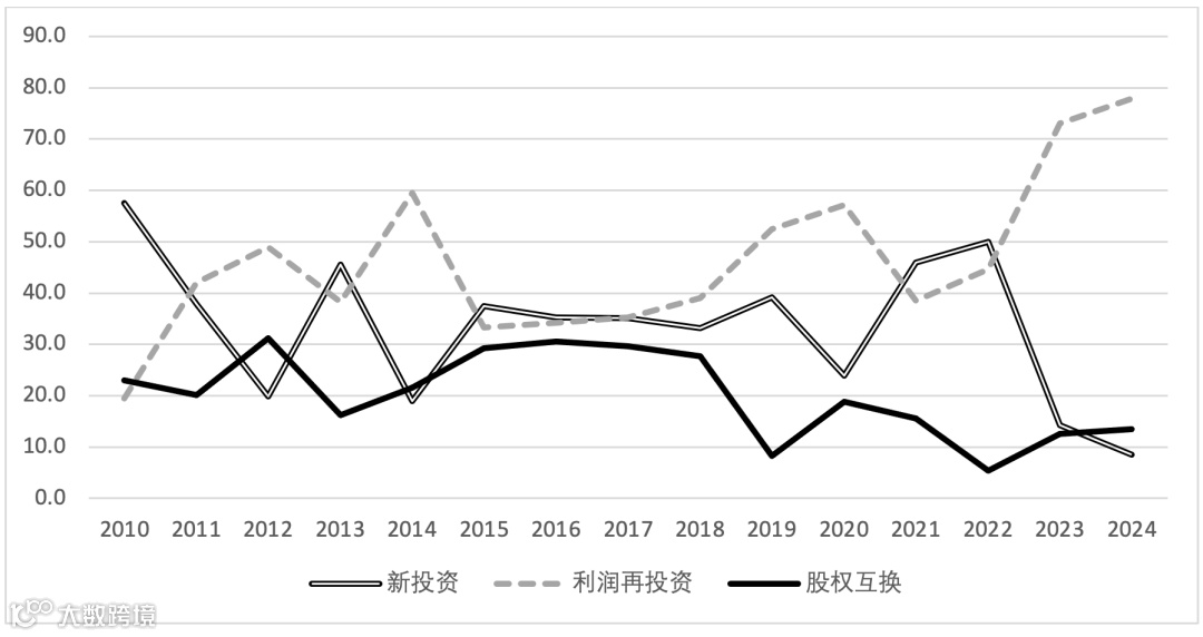 通过对墨西哥接收外商直接投资金额分析可以发现,尽管在2023和2024年期间,外商直接投资金额一直处于上升趋势,但年增速开始递减,从2021和2022年期间的18.8%和8.3%分别降至0.4%和1.1%。更为重要的是,在总金额中,新投资项目占比则逐年减少,在2024年,仅有8.6%;相对来讲,利润再投资的重要性则越来越大,上升至历史最高水平,77.9%。换句话说, 2024年,墨每接收100美元的外商直接投资,接近4/5即80美元属于那些已经在经营之中的外企利润再投资(图1)。