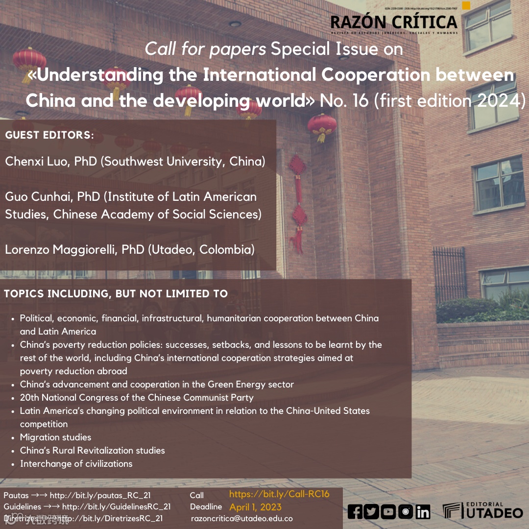 For its 16th Issue, commemorating the 10 years of the Belt and Road initiative and the 10 years of the foundation of the Confucius Institute – Utadeo, the Editorial Committee of Razón Crítica invites scholars to submit papers dealing with aspects of international cooperation between China and Latin America, particularly focusing on the Belt and Road Initiative.