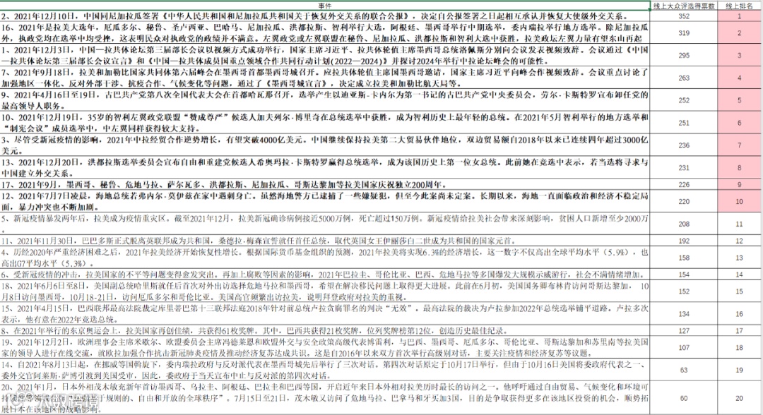 线下共有19名专家参与现场投票。经过线上网友投票和线下专家投票加权之后,评选出的“2021年‘拉丁美洲十大事件’”结果如下: