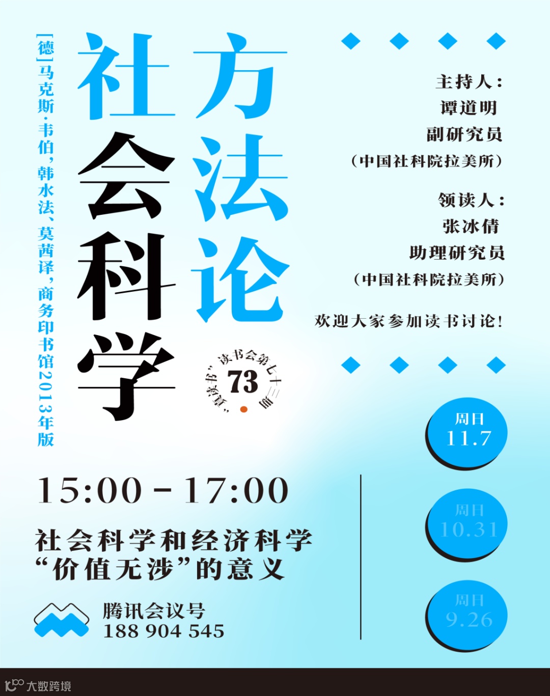 所的工作特别忙,几位领读老师都分担了比较重的任务,读书会就暂停了几周。今天我们请到的领读人是张冰倩老师。她生于1994年,是个90后,差一点就是95后,是我们拉美所目前最年轻的科研人员,刚刚毕业于中国社科院大学经济学院,所学的专业是国民经济学。如果我没记错的话,韦伯早期研究的也是国民经济学,就任弗莱堡大学国民经济学教授,后来才越来越多地涉入社会学研究。韦伯将国民经济学视为“人的科学”。《社会科学方法论》也是在回应当时德语界国民经济学的“方法论之争”(理论学派与历史学派之争)。所以,本期由冰倩领读在专业上非常合适。下面就有请冰倩。