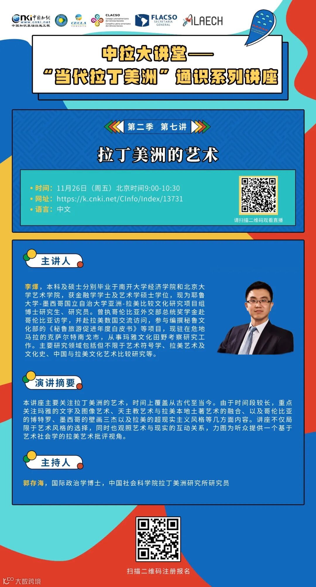“中拉大讲堂”包括“当代拉丁美洲”和“当代中国”两个通识系列讲座,每个通识系列十五讲,将由来自中国、墨西哥、阿根廷、巴西、智利、美国、西班牙、委内瑞拉、哥伦比亚、秘鲁、厄瓜多尔等国的知名学者主讲,议题涉及中拉经济、外交、气候政策、知识创新等。