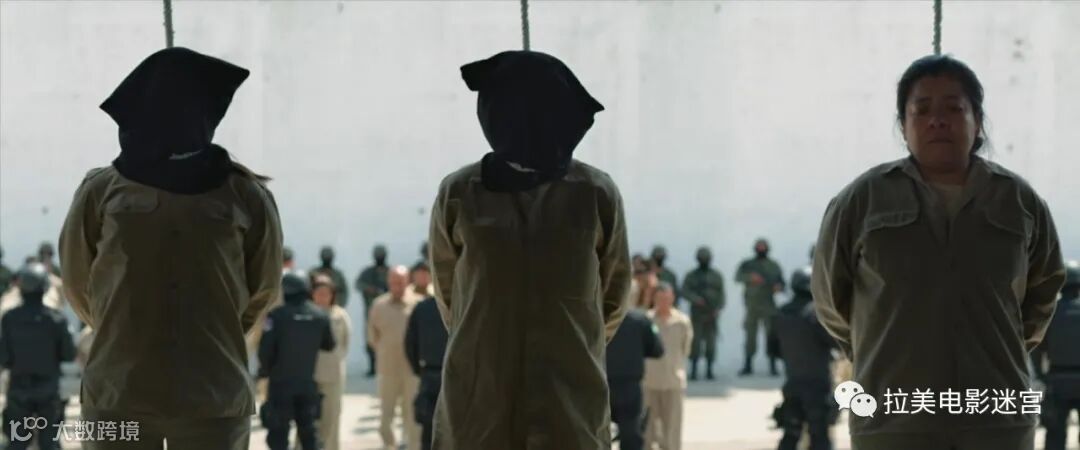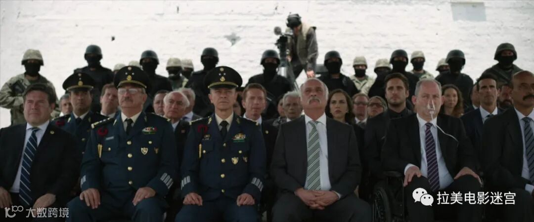 最后一幕,则是一个超稳定的全景画面,一边是军事政要,一边是巨富商贾,他们庄严静默地观看着穿着囚服印第安人排队依次被绞死。他们背后,一排蒙面持枪的军人正在用武器建立所谓“新秩序”。然后,黑色背景上出现了充满银幕的白色字迹:反写的“Nuevo orden”(新秩序),之后,玩笑一般,所有的片尾字幕都如镜像一般左右颠倒,一如乌托邦(utopia)与反乌托邦(dystopia)的镜像关系。