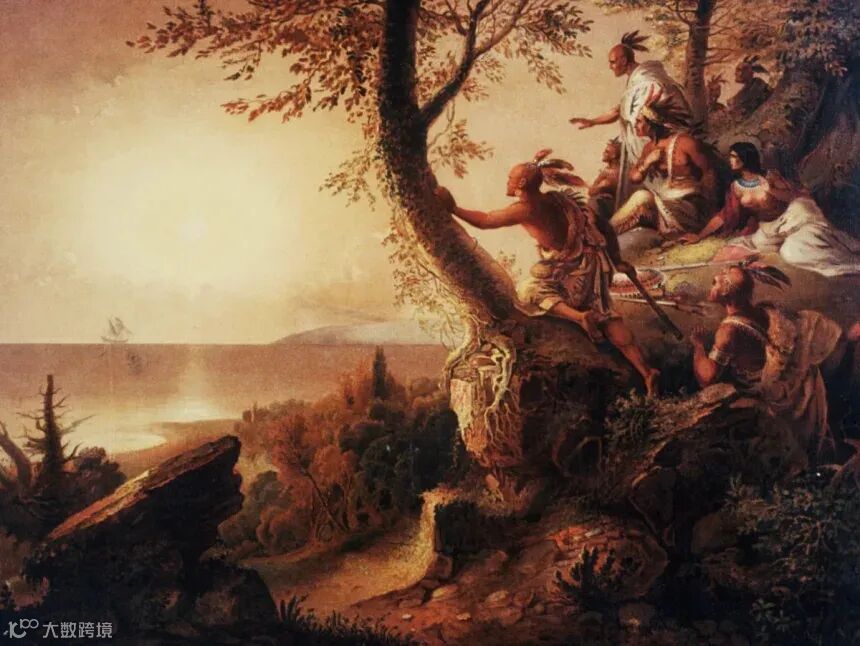 一群美洲原住民看着他们下方海湾中的一艘帆船(图片来源:history.com)