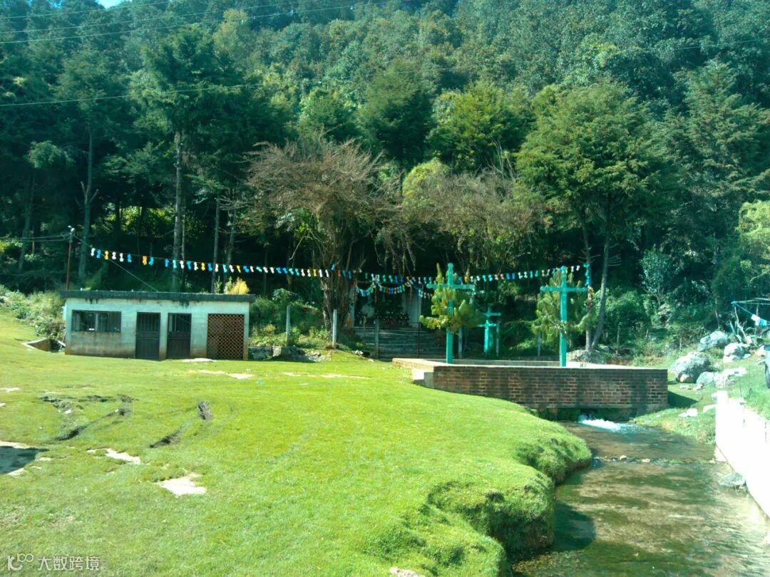 墨西哥佐齐尔村社中矗立在河流中的十字架(作者摄)
