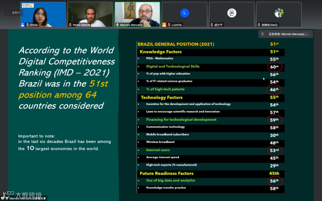 马塞洛博士分析了巴西的数字经济发展。根据2021 IMD全球数字竞争力排名显示,巴西在64个国家中排名第51位。在2019全球创新指数国家中排名第66位。因此巴西的数字发展水平仍有待提升。但巴西同时也是拉丁美洲创业公司的诞生地,2021年洛杉矶10大创业公司中巴西占7家,且2021年巴西拥有21家市值超过10亿美元的初创公司。巴西虽是一个数字技术使用大国,但其数字技术的发展却比较缓慢, 巴西初创公司的成功体现了金融和食利者的较量,而并非表明巴西整体的创新和技术能力的体现。自新冠疫情爆发以来,随着巴西数字平台的发展,也相应提供了一些就业机会,但数字平台正在削弱和分散工作活动。因此,巴西的数字经济发展速度现阶段相对缓慢,但随着平台资本主义模式的深入发展,正在影响着巴西未来的数字技术发展方向。