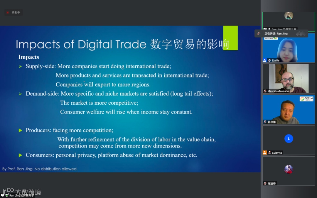 2021年11月11日,“中巴数字对话”系列第三讲由对外经贸大学经济贸易学院国际贸易系主任荆然教授主讲。她聚焦“数字贸易的兴起与中国”,重点分析数字贸易的发展及其带来的影响。荆然教授结合其自身的专业背景,从国际贸易的角度出发,向中国与巴西观众讲述数字贸易的概念。她指出,数字贸易是 “以数字方式订购”和“以数字方式交付”两大模式组成的国际贸易。随后,荆然教授讲述贸易方式的数字化趋势。她指出,在传统服务业中,消费和提供服务的过程处于同一时间、同一地点。时间的同一性使服务不具有可存储性,而地点的同一性则表明不具有可运输性。但数字化的发展改变了传统的服务方式,使得服务具有可存储性,例如在线教育的兴起与发展。通过通信技术传输,使得服务行业具有可移动性,例如远程医疗的发展。信息技术的发展同时也使新的交易对象成为可能,生产要素、产出或服务越来越多地以数字形式呈现出来。此外,在传统国际贸易的各个方面,如市场营销、签约、物流、清关、售后服务,都呈现数字化趋势。网络展览、数字海关、海外仓库、网上支付结算、网上财税服务等新业态、新模式也不断涌现。近年来,由于跨境电商的蓬勃发展,网上推广、网上零售、移动支付等跨境销售模式愈来愈普遍,也是数字经济不断发展的体现。