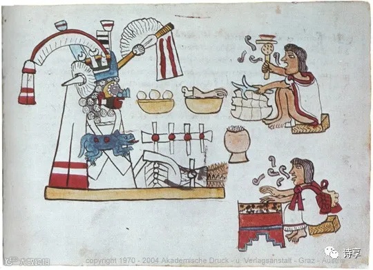 也就是说,ayotl这种打击乐器是用于死神祭献日的。而另一人手拍的鼓形乐器便是huehuetl,鼓面一般用美洲豹皮制成,可在抄本图中看出。这两种“活”的乐器中,融合了龟和豹的元素,而在古代阿兹特克文明中,这两个元素都与水和黑暗有关,而这两者又是与死亡关联的象征物,因此ayotl和huehuetl两种乐器具有重要的宗教意义。