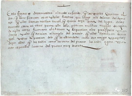 这幅图,展现了印第安人在向亡灵之主祭献那日,令人作呕的情形。死神面前放置了许多装着人肉的陶罐,然后把肉分给掌权者和神庙的祭司。他们再把肉分给朋友和家人。他们说吃起来像猪肉,所以猪肉需求很大。