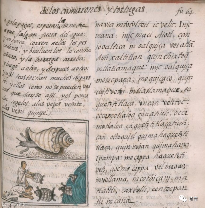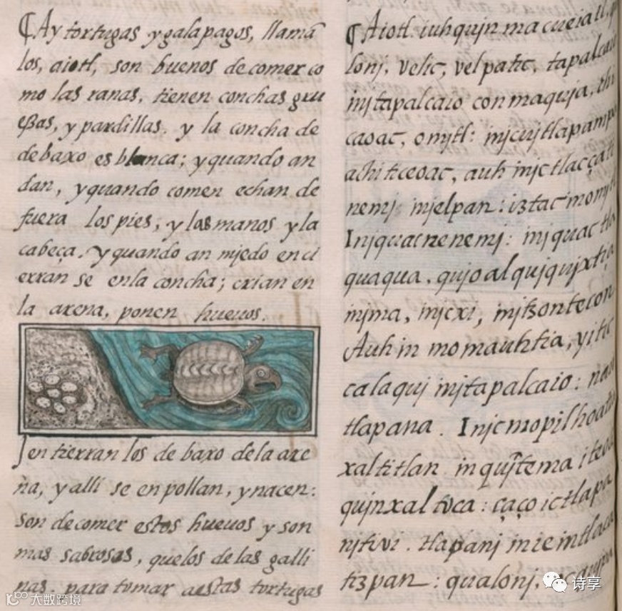 在这个背景下,我突然想到在16世纪传教士的手抄本中会不会有龟类记载呢?古代阿兹特克人是不是也会养殖或吃龟呢?我好奇地打开萨阿贡修士的《弗洛伦萨手抄本》自然卷,果然有不小的发现。